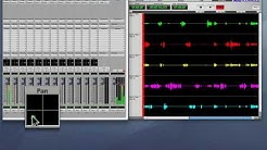 To the left of each pair of Mix tiles are thin inset tiles that are used to join two mix busses into a stereo bus. If the busses are joined, the associated mixer will have pan knobs for each of the mono hardware channels. If the bus is a mono bus, there are no pan knobs associated with the input channels.